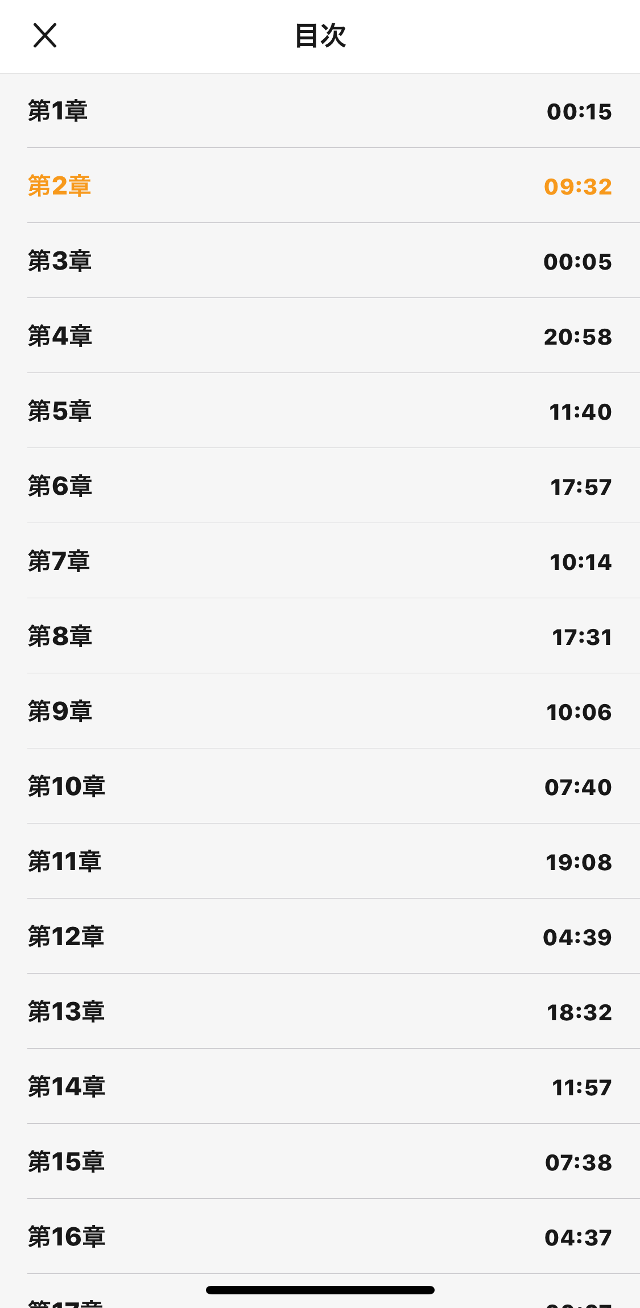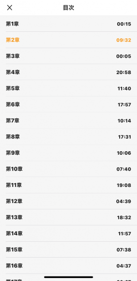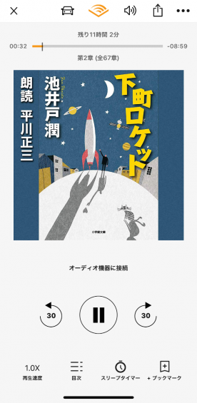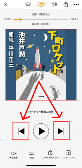 ちなみにジャケットをタップすると、オーディオコントロールを変更することができ「30秒」ボタンが「次の章」「前の章」に変化します。
